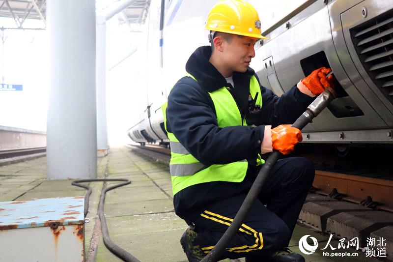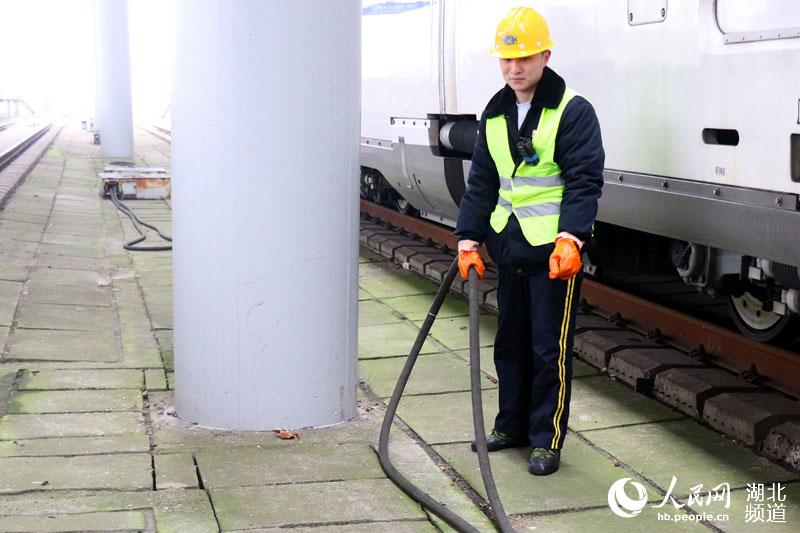 8時5分,宜昌市的室外溫度是5攝氏度。鄭堯和師傅黃祥斌從待班室出發(fā),走到了三站臺宜昌東開往北京西的G556次列車后面。他們必須在8時18分列車開車以前,為這趟編組為16輛的高速列車組加滿水,以確保列車運(yùn)行到下一個加水站。