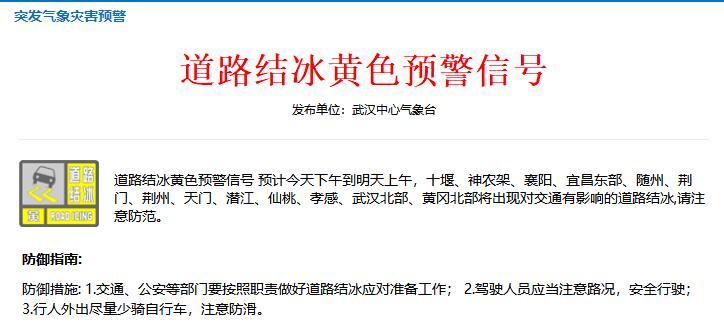 道路結冰黃色預警信號 預計今天下午到明天上午,十堰、神農架、襄陽、宜昌東部、隨州、荊門、荊州、天門、潛江、仙桃、孝感、武漢北部、黃岡北部將出現對交通有影響的道路結冰,請注意防范。