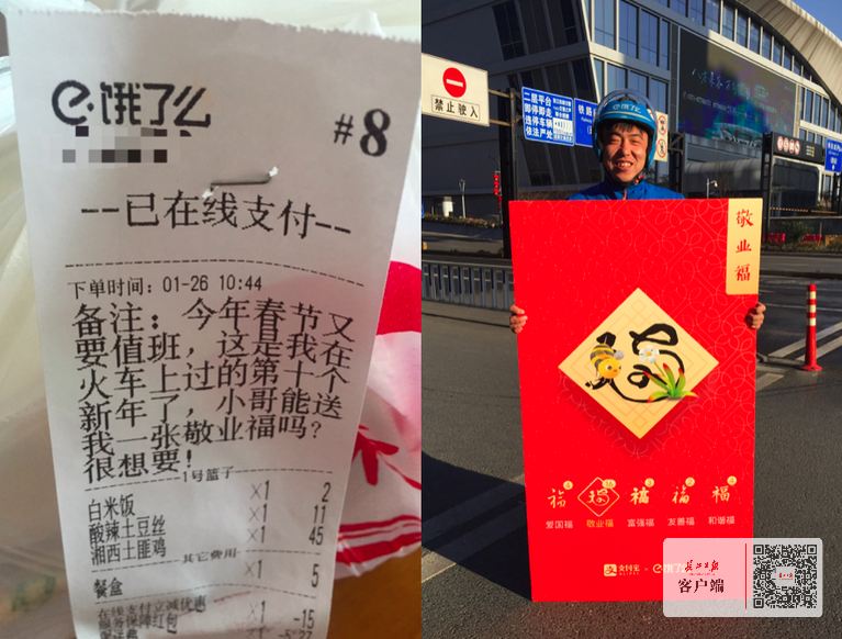 有位高鐵乘務員在點外賣的時候備注:今年春節又要值班,這是我在火車上過的第十個新年了,小哥能送我一張敬業福嗎?很想要!