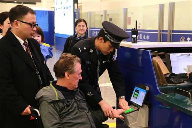 圖為天河機場口岸,邊檢民警開辟綠色通道,為行動不便的外國旅客采集生物信息,助其順暢通關。(視界網 王璐穎 攝)