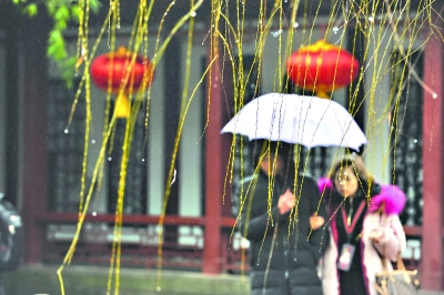 2月12日,武漢春寒料峭,黃鶴樓公園里柳枝即將抽芽萌發(fā),游客在蒙蒙春雨中賞景游園 長江日報(bào)記者苗劍 攝 (線索提供 江萌)