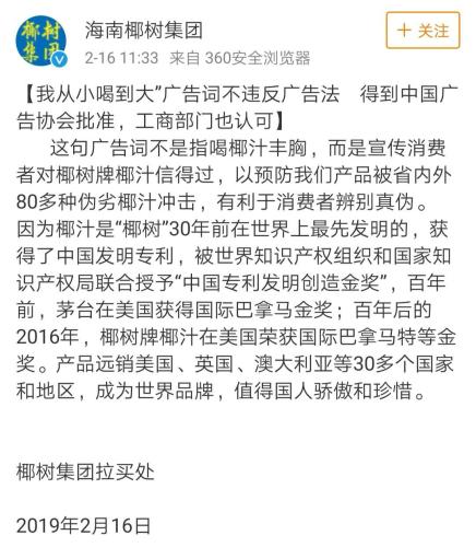 中新網客戶端2月16日電(謝藝觀) 面對廣告詞“從小喝到大”引發的質疑,椰樹集團16日通過官方微博表示,“我從小喝到大”廣告詞得到中國廣告協會批準,工商部門也認可。這句廣告詞不是指喝椰汁豐胸,而是宣傳消費者對椰樹牌椰汁信得過,以預防我們產品被省內外80多種偽劣椰汁沖擊,有利于消費者辨別真偽。