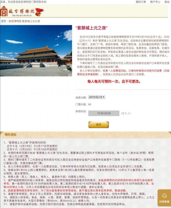 17日,故宮博物院官網(wǎng)發(fā)布公告,將于19(正月十五)、20(正月十六)兩天舉辦“紫禁城上元之夜”文化活動(dòng),這也是故宮首次面對(duì)公眾開(kāi)放夜場(chǎng)。剛開(kāi)放預(yù)約,19日的門(mén)票瞬間“秒光”,按原計(jì)劃,18日開(kāi)始預(yù)約2月20日的門(mén)票,目前,兩天的夜場(chǎng)名額已全部預(yù)約售罄。有網(wǎng)友反映,凌晨打開(kāi)票務(wù)系統(tǒng)時(shí)網(wǎng)頁(yè)崩潰了。你搶到票了嗎?(任思雨)