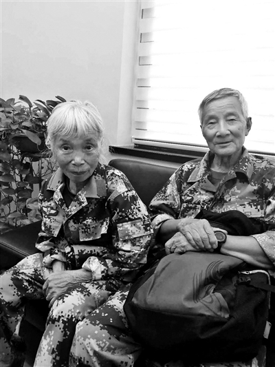 馬旭與丈夫顏學用穿著空降兵作訓服在銀行等待