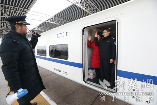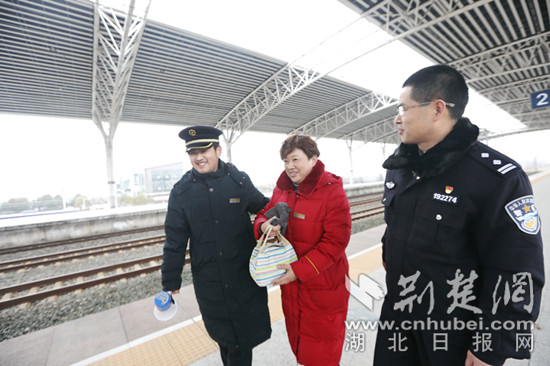 王宏勛、龔吉慧在潛江火車站見到正在工作的兒子(通訊員馮暢 攝)