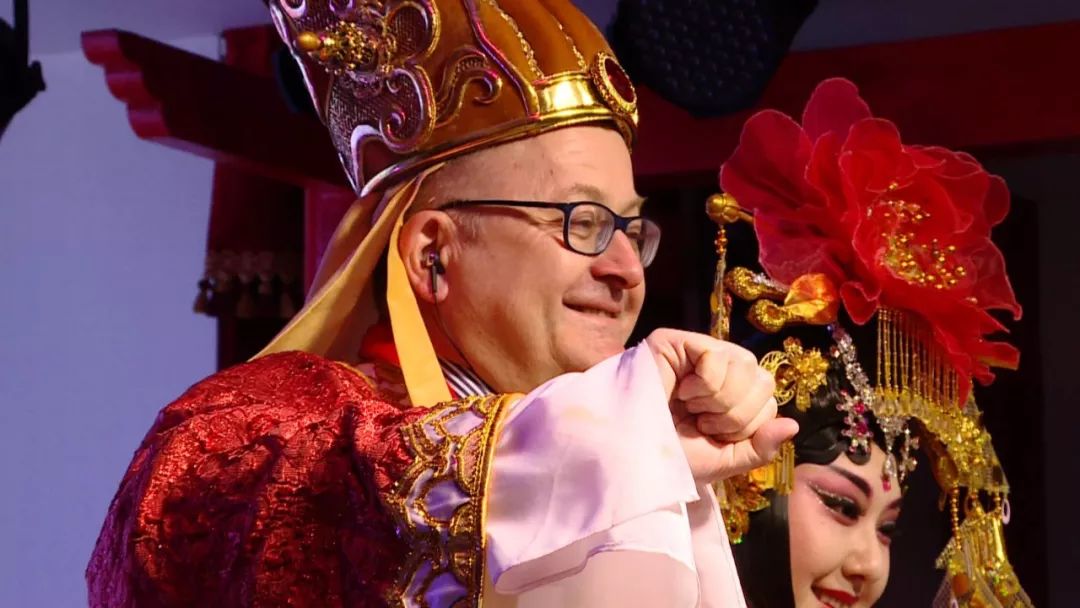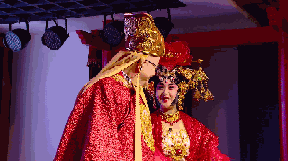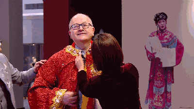 穿上戲服裝,向漢劇傳人王荔學戲法,