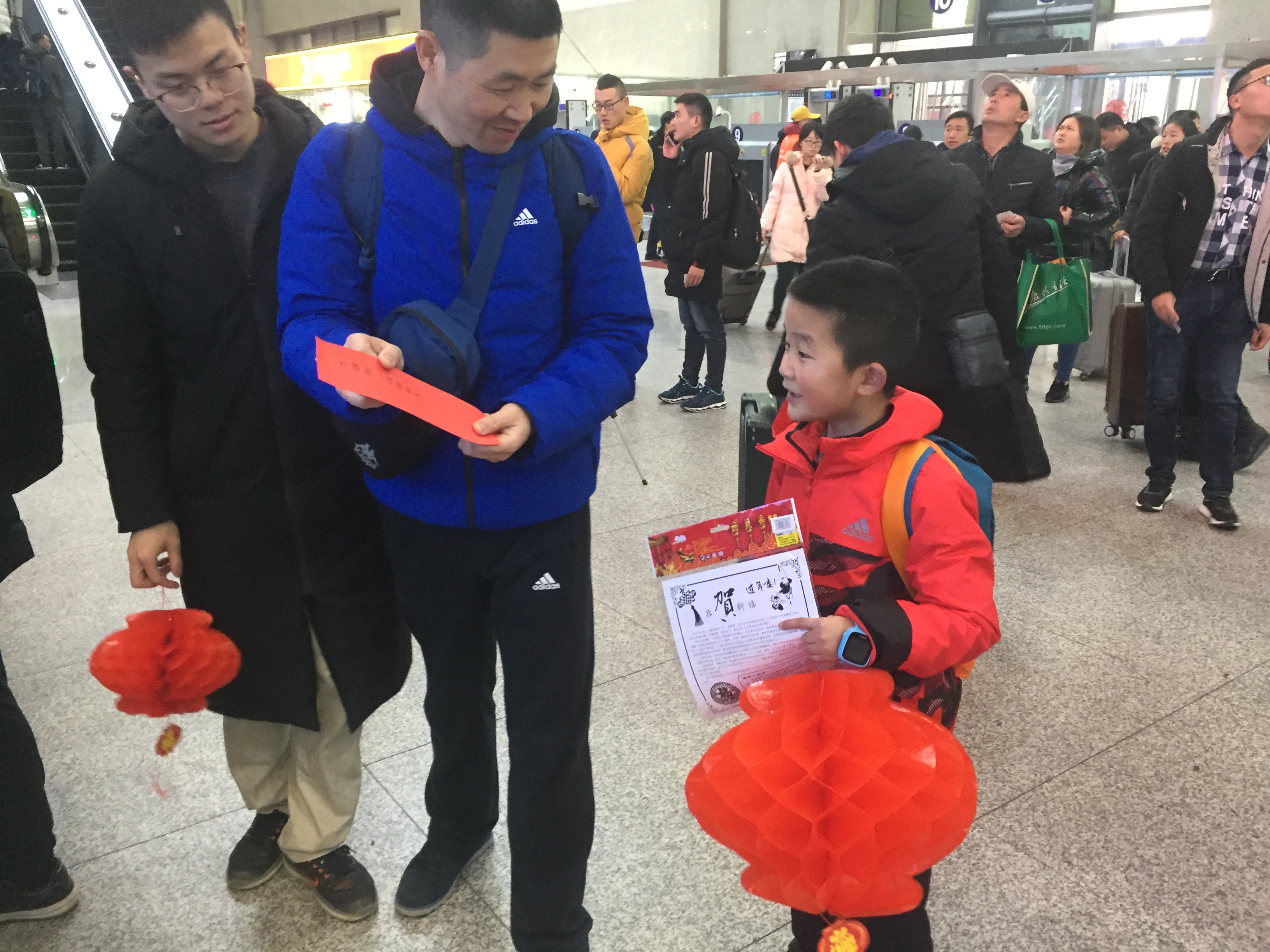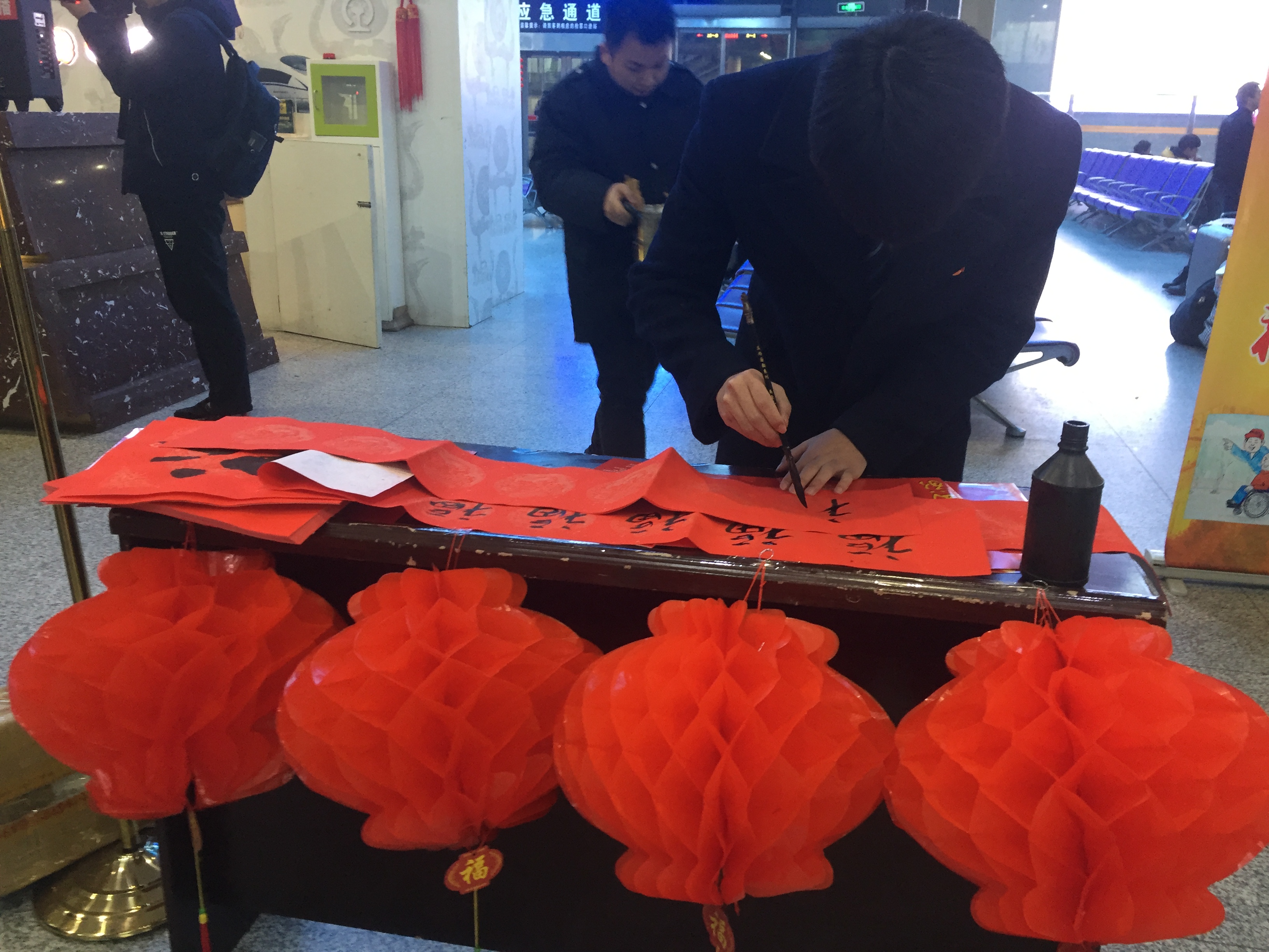 上午9:00分,隨著來自武鐵“小桔燈”志愿者和武漢鐵路職業技術學院的春運實習學員聯袂奉獻的《甜蜜元宵——溫暖春運旅途》為主題詩朗誦的開始,候車室里的元宵節正式“啟幕”。鐵路工作人員現場寫“福”字、送“福”字、掛“福”字,把來自家鄉火車站的深情祝福送給即將返崗返校的旅客們。