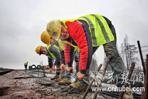2月19日,武漢軍運(yùn)會(huì)保障項(xiàng)目吳新干線的建設(shè)者忙碌在工地上。 攝影:周俊