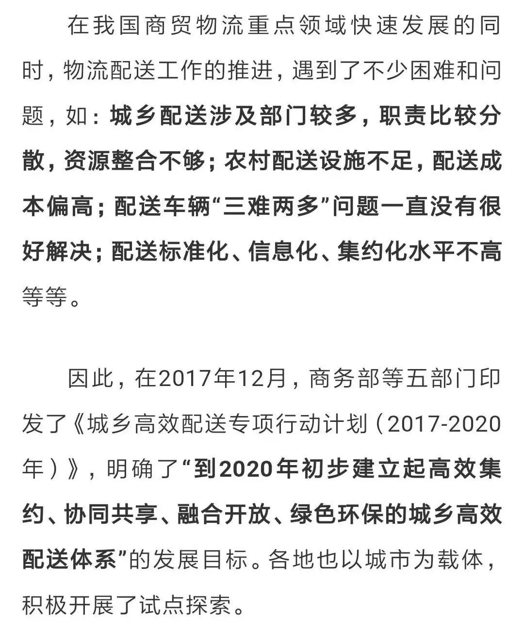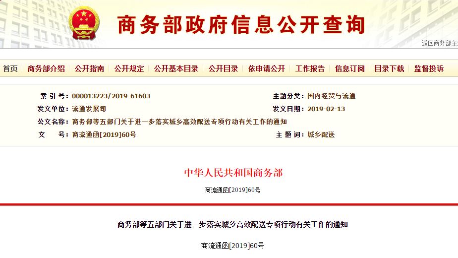 2月13日,商務部、公安部、交通運輸部、國家郵政局、供銷合作總社聯合下發了關于進一步落實城鄉高效配送專項行動有關工作的通知,明確了首批30個城市的專項行動目標、任務和具體舉措。