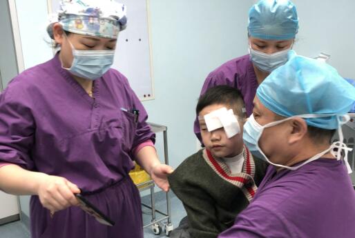 接診的眼科主任彭建軍立刻為孩子進行了檢查,發現眉弓一直到太陽穴有一條長約6厘米的傷口,此處皮膚較薄,已經可見骨頭,需要立刻進行傷口清創縫合,原本局麻的手術,由于孩子不配合,手術被迫已經推遲了5個小時。麻醉科主任許秋平和護士長楊娜得知情況,不顧手術后的疲憊,許主任輕輕抱起孩子,坐著手術等待區,一旁的楊護士長蹲著一旁,手里舉著正在播放動畫片的手機,俊俊安靜了下來,醫生順利為他進行了靜脈穿刺,在眼科和麻醉科醫生的配合下,縫了20多針,將傷口完美縫合。