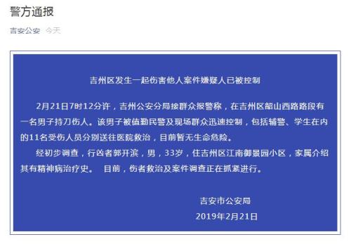 “吉安公安”微信公號今日發布一則警方通報稱,2月21日7時12分許,江西吉安市吉州公安分局接群眾報警稱,在吉州區韶山西路路段有一名男子持刀傷人。該男子被值勤民警及現場群眾迅速控制,包括輔警、學生在內的11名受傷人員分別送往醫院救治,目前暫無生命危險。