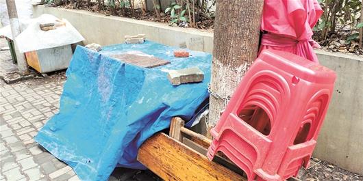 記者采訪過程中,一名中年男子解開一條鎖住餐車的鐵鏈。他自稱姓丁,在這里擺餐飲攤近兩年,主要供應中餐。他是最近才把餐車等用鐵鏈鎖在行道樹上的,主要目的是防盜。他表示,如果此舉違規,以后營業結束后,他會把餐車收走,不再用鐵鏈鎖在行道樹上。