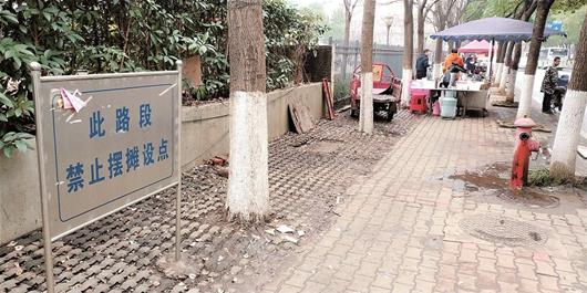 30米外的人行道上,豎著一塊“此路段禁止擺攤設點”的警示牌。離警示牌約3米處,還有兩個早點攤位。