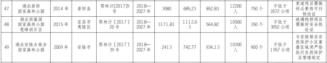 湖北安陸古銀杏國家森林公園規劃總面積為2413公頃、核心景觀區面積為742.77公頃、生態保育區面積為934.13公頃,日游客容量為10300 人,最大床位數為900 個,林地面積不低于1957 公頃 。批復中要求與安陸銀杏自然保護小區重疊區域須嚴格執行自然保護區管理規定。