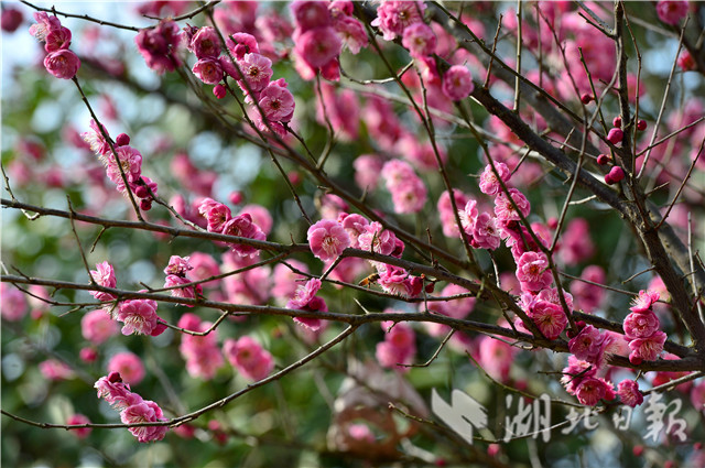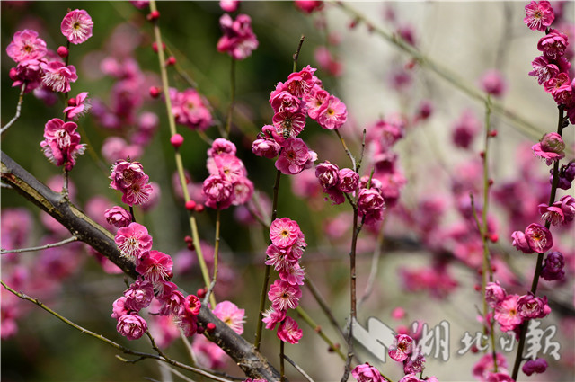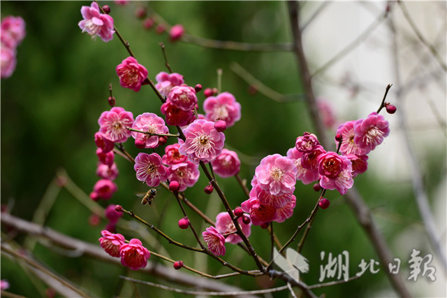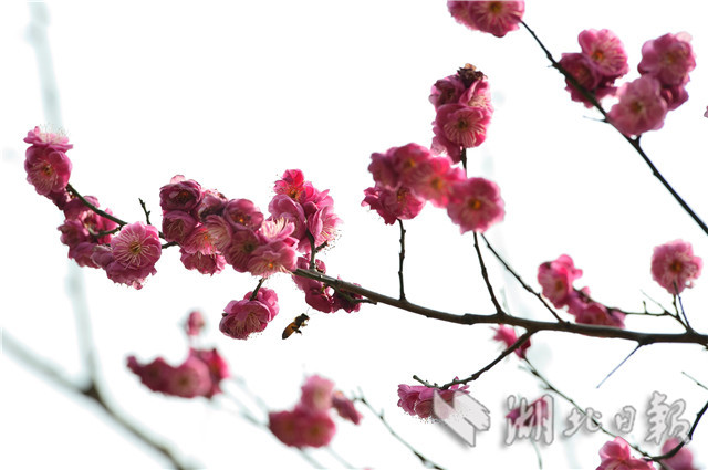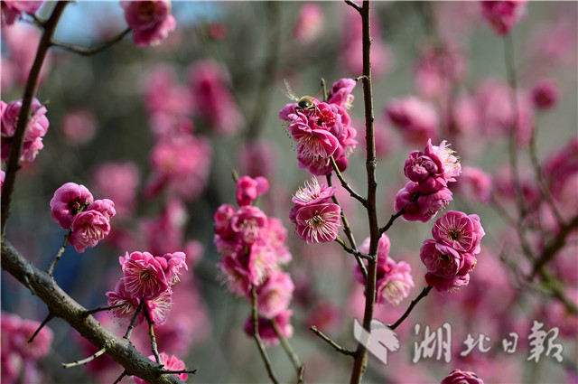 2月25日,蜜蜂在保康縣清溪河景觀公園內盛開的梅花上采花粉。近日,保康縣清溪河景觀公園內的梅花競相怒放、爭奇斗艷,吸引成群的蜜蜂繞花飛舞,忙碌采蜜。