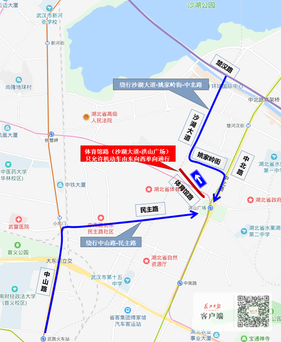 1、楚漢路方向前往洪山廣場方向的車輛可繞行沙湖大道—姚家?guī)X街—中北路;