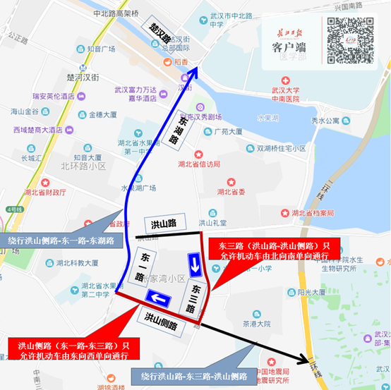 1、前往楚漢路方向的車輛可繞行洪山側(cè)路—東一路—東湖路;