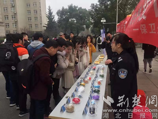 為加強大學生對毒品危害的認知,進一步有效提升大學生防范、抵制毒品的意識和自我約束、自我保護的能力,東新民警當天還擺起了“攤位”,將各類型的毒品樣品拿到現場,讓大學生能夠直觀的了解。同時,配合禁毒手冊和相關案例詳細的向大學生們解讀了毒品的危害,傳授了抵制毒品的方法。