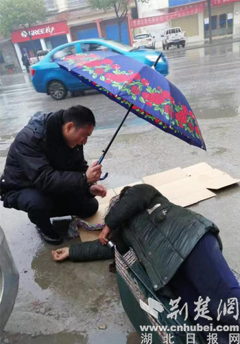 荊楚網客戶端—荊楚網消息(通訊員 黃翔)近日,一名老人摔倒在路面上陷入昏迷,荊門市沙洋縣公安局高陽派出所民警單膝跪地為其撐傘擋雨,直至救護車趕到。