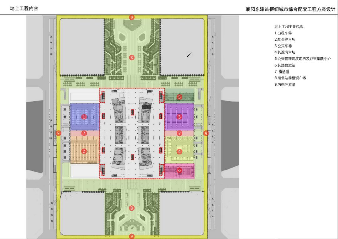襄陽東津站樞紐城市綜合配套工程包含:南北站前廣場、長途客運站、公交樞紐站、游客集散中心、出租車停車場、社會停車場、非機動車停車場、內部循環道路、集疏運匝道、落客平臺、預埋軌道交通車站、地下旅客服務設施、地下人防工程等內容,規劃總用地面積37.07公頃,建筑面積21.78萬平方米。