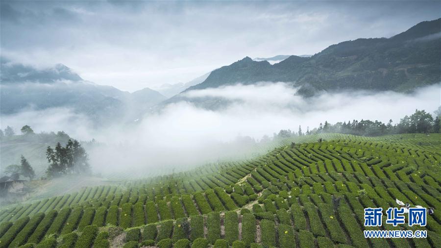 湖北省恩施市屯堡鄉花枝山村的恩施玉露茶葉基地云霧繚繞。新華社 發