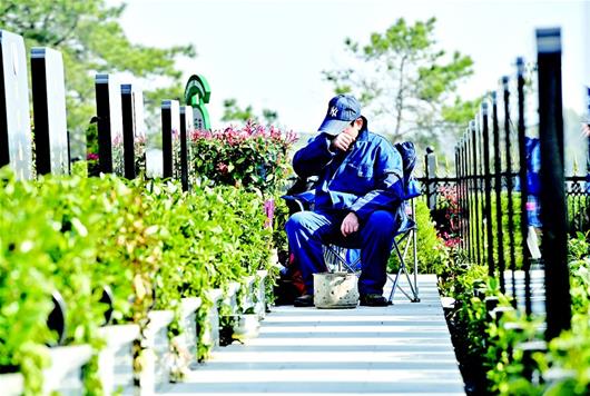 春天的長(zhǎng)樂(lè)園綠意盎然,清晨7時(shí)許,空曠的陵園里,拖著折疊椅的于軾獨(dú)自蹣跚地走向楊慧的墓地。三年來(lái),無(wú)論寒暑,無(wú)懼風(fēng)雨,沒(méi)有什么能夠阻止他來(lái)這兒與逝去的妻子說(shuō)一下話。陵園工作人員曾多次勸老人先在接待大廳休息會(huì)兒,等8點(diǎn)陵園工作人員上班后,用擺渡車送他上去,都被于軾婉言拒絕,因?yàn)樗暗炔患埃炔患鞍研闹械脑捪驉?ài)人訴說(shuō)。”