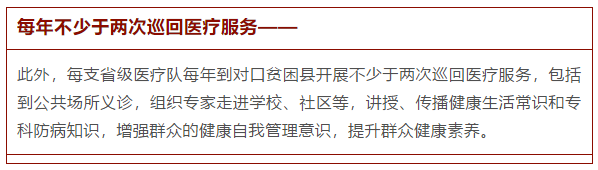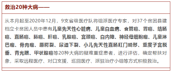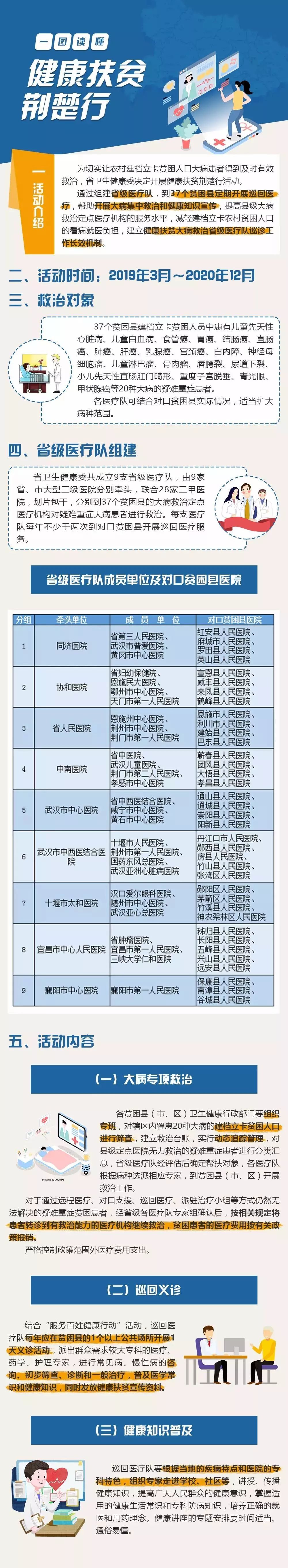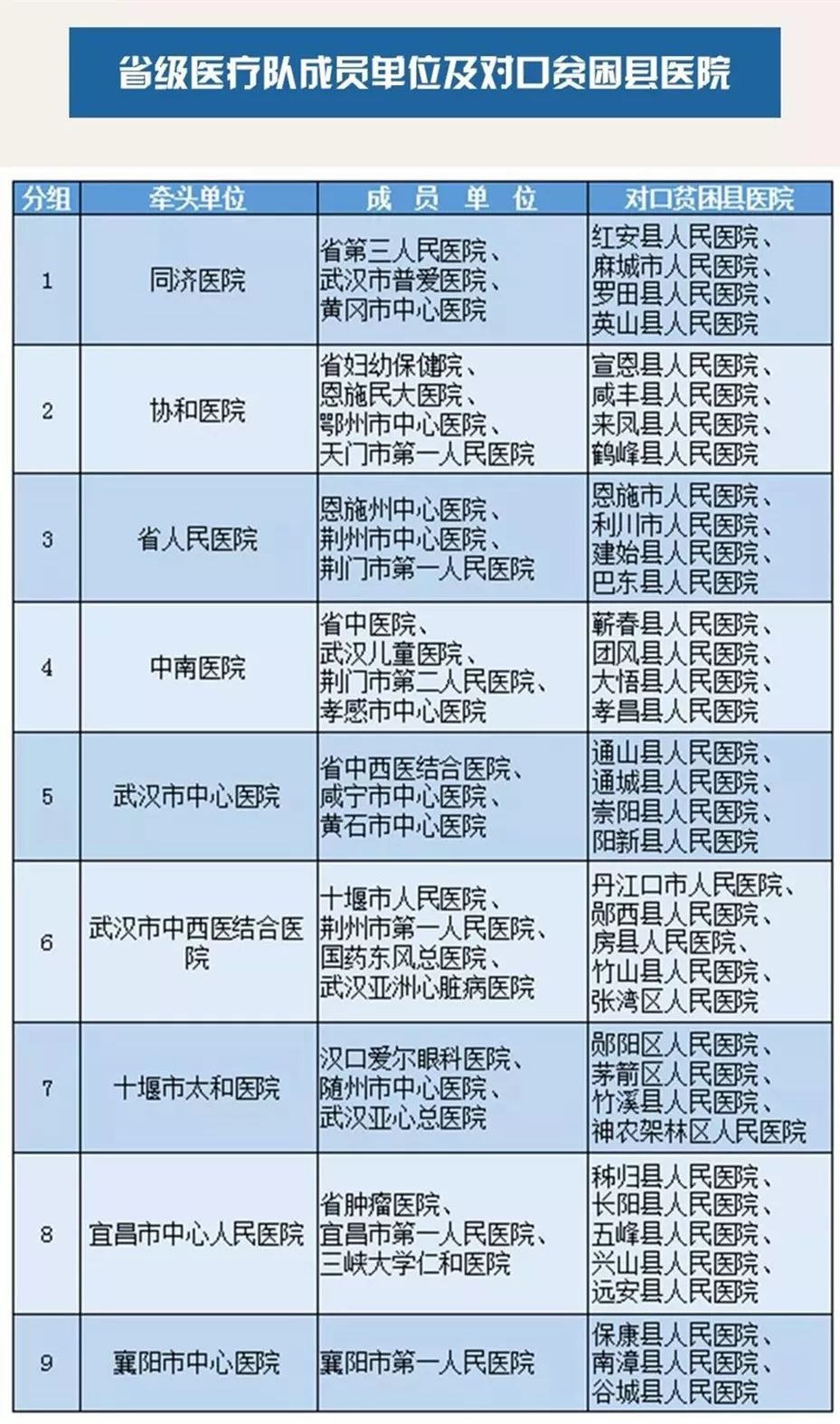 從今年起,湖北省9家大型三甲醫(yī)院牽頭,聯(lián)合省內28家三甲醫(yī)院,共成立9支省級醫(yī)療隊,劃片包干,分別到37個貧困縣,開展為期兩年的“健康扶貧荊楚行”活動,重點開展疑難重癥大病患者篩查、定點救治、巡回義診和健康知識普及。