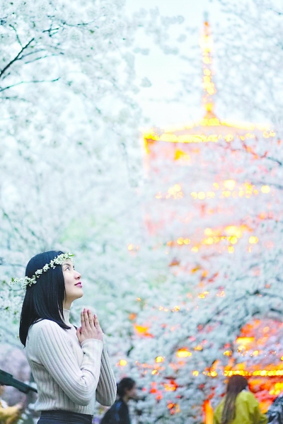 古箏悠揚(yáng),池塘邊的亭臺(tái)上,身穿古裝的女子揮動(dòng)長(zhǎng)袖,在櫻花樹(shù)下浪漫起舞。黃昏細(xì)雨飄灑,9000多個(gè)夜間燈組、500個(gè)燈籠瞬間點(diǎn)亮,五重塔染上金色,櫻海花影如夢(mèng)如幻,讓人心頭震顫。