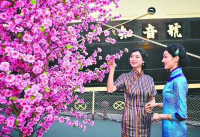 旗袍女孩站在“知音號(hào)”躉船上的“桃花樹(shù)”下,仿佛經(jīng)典電影里的橋段