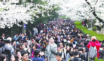 武漢大學(xué)櫻花大道,大片櫻花連成粉白云海