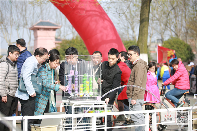 “這是為蓮花湖設(shè)計(jì)的水科技景觀,分為三個(gè)步驟。”二十三初中八(6)班馮瑞文同學(xué)向前來(lái)體驗(yàn)的市民介紹:“第一個(gè)步驟是抽水系統(tǒng),通過(guò)踩踏自行車,把動(dòng)能轉(zhuǎn)化為電能,既健身,又抽水。第二個(gè)步驟是凈化系統(tǒng),將水抽入凈化池后,第一層的鵝卵石過(guò)濾粗沙子,第二層的火山石做生物凈化、石英石做物理凈化,第三層有活性炭和過(guò)濾棉,還有水生植物做植物凈化。第三個(gè)步驟是最有創(chuàng)意的地方,掃描二維碼進(jìn)入小程序,里面會(huì)顯示你騎行的圈數(shù)和凈化的水量。達(dá)到一定數(shù)值后,還能免費(fèi)領(lǐng)取一份植物種子,后面那個(gè)終端系統(tǒng)會(huì)自動(dòng)彈出你想要的種子,就像扭蛋機(jī)一樣。”