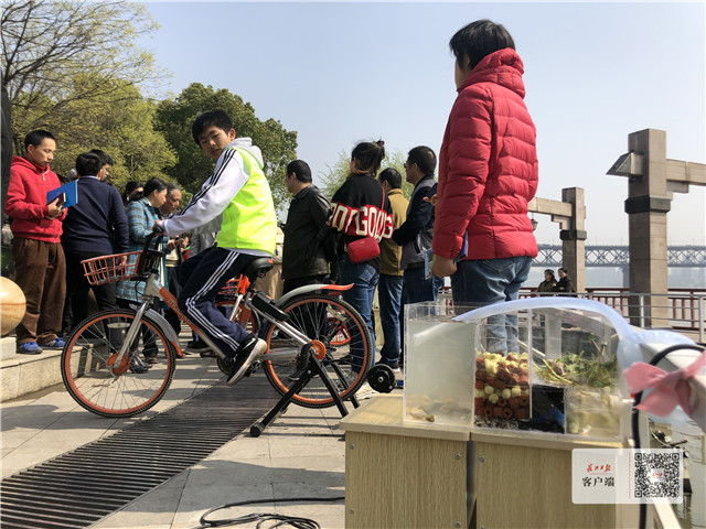 長(zhǎng)江日?qǐng)?bào)融媒體3月25日訊在湖邊騎車鍛煉時(shí),還能凈化城市里的湖水水質(zhì),一群初中生想出了這個(gè)創(chuàng)意并設(shè)計(jì)出抽水凈化健身車。3月25日,在“童心親水伴荷香——漢陽(yáng)區(qū)愛(ài)水護(hù)湖志愿者在行動(dòng)”啟動(dòng)儀式上,武漢市第二十三初級(jí)中學(xué)的水科技發(fā)明讓不少市民大開眼界,一排抽水凈化健身車引來(lái)不少人爭(zhēng)相體驗(yàn)。