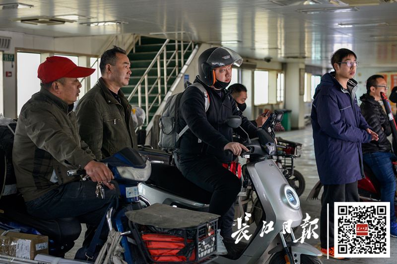3月25日,騎著電瓶車的乘客正在搭乘輪渡過江