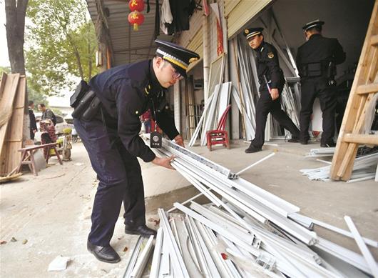 30分鐘的消防演練結束后,潘迪又重新換回城管服,與執法隊隊長徐偉山等一道,開著巡邏車沿著徑河街張北路、塔西路巡邏。巡邏至一家機動工具維修店門前,他們發現3臺空壓機擺在人行道上,影響市民出行。“你好,你違反了門前三包規定,請立即改正。”潘迪說。店主慌忙在潘迪等人的幫助下,將空壓機抬進店內,并保證今后不占人行道。