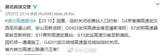 而@湖北高速交警 發布的信息顯示,27日深夜11點12分,湖北已有部分高速收費站因霧臨時關閉。(記者劉磊 周建華 攝)