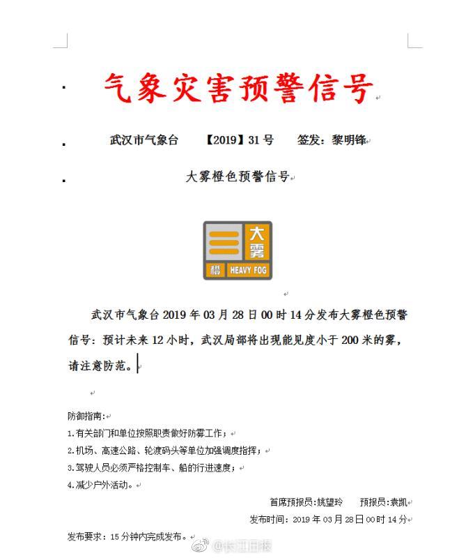 據@長江日報微博 28日凌晨0點28分,武漢市氣象臺發布大霧橙色預警信號,預計未來12小時,武漢局部將出現能見度小于200米的霧,請注意防范。