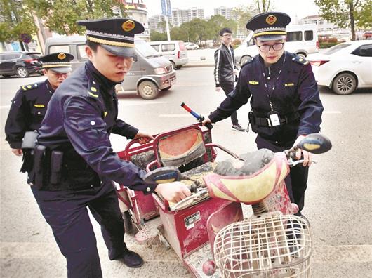 30分鐘的消防演練結束后,潘迪又重新換回城管服,與執法隊隊長徐偉山等一道,開著巡邏車沿著徑河街張北路、塔西路巡邏。巡邏至一家機動工具維修店門前,他們發現3臺空壓機擺在人行道上,影響市民出行。“你好,你違反了門前三包規定,請立即改正。”潘迪說。店主慌忙在潘迪等人的幫助下,將空壓機抬進店內,并保證今后不占人行道。
