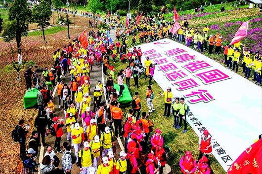 上午8時30分,近百個來自漢陽、青山、黃陂、江夏、蔡甸、紅安等地的戶外運動團,在徒步大會起點聚集。選手們將從龍靈山公園西門出發(fā),經(jīng)九曲灣濕地、十里花坡等景點,繞行龍靈山公園一周后回到起點,全程10.5公里。