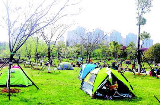 圖為:廟山韻湖公園,不少游人在帳篷里休息 楚天都市報記者李輝攝
