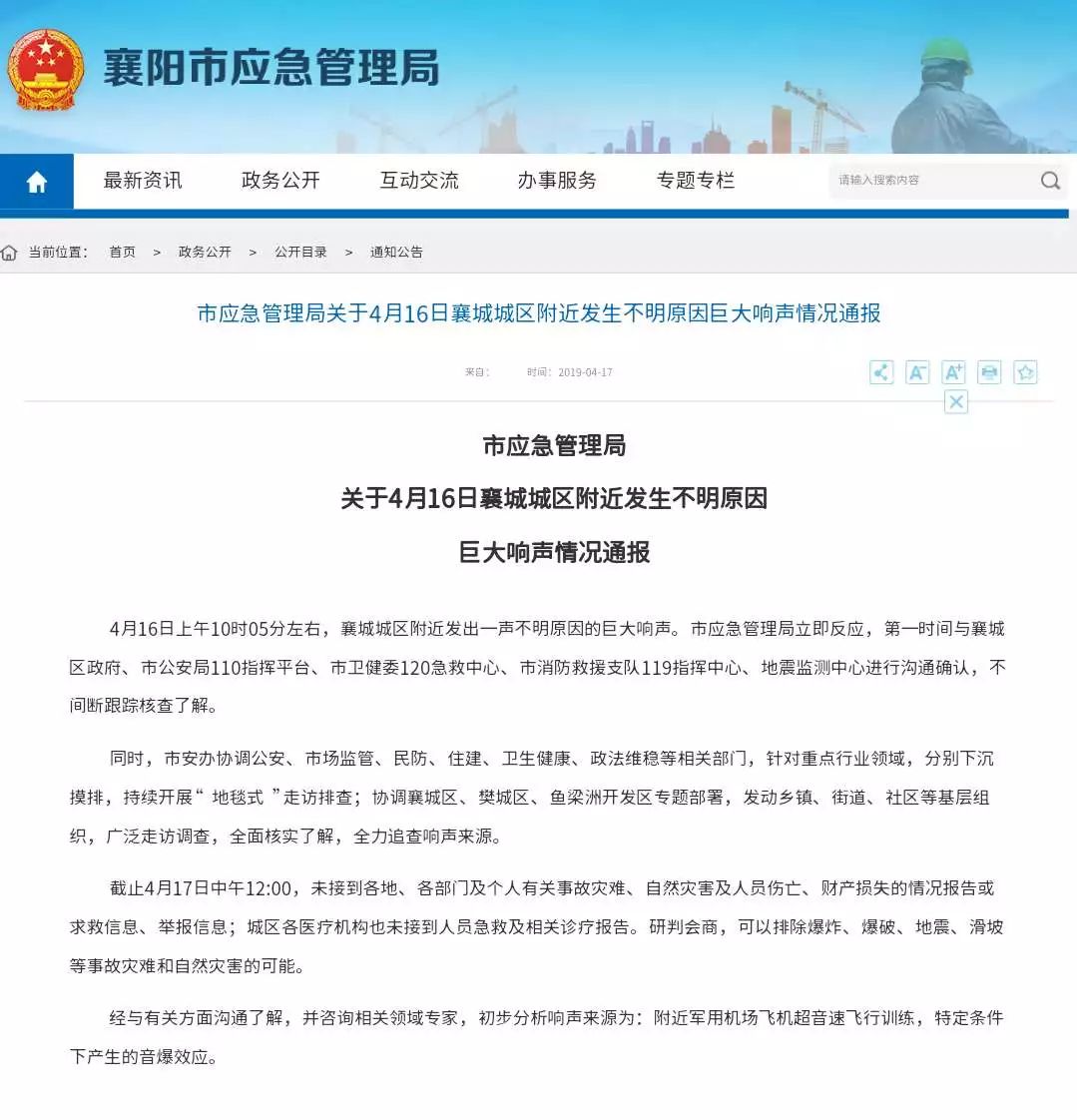 4月16日上午10時05分左右,襄城城區附近發出一聲不明原因的巨大響聲。市應急管理局立即反應,第一時間與襄城區政府、市公安局110指揮平臺、市衛健委120急救中心、市消防救援支隊119指揮中心、地震監測中心進行溝通確認,不間斷跟蹤核查了解。