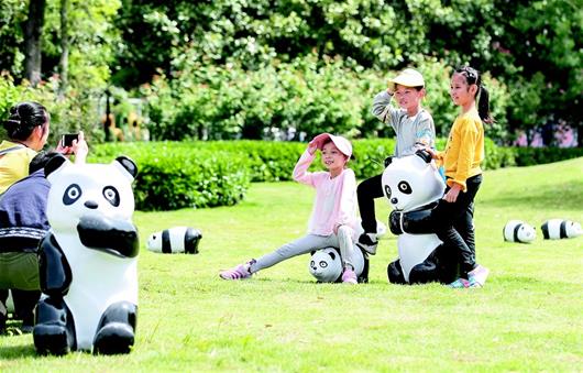 圖為:5月1日,武漢歡樂谷迎來了大量游客。圖為家長帶著小朋友在武漢歡樂谷熊貓樂園留影。(湖北日報全媒記者柯皓通訊員周顏佳攝)