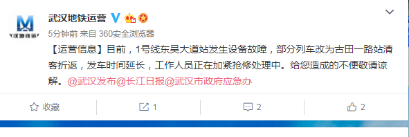 據武漢地鐵運營官方微博13:50消息:目前,1號線東吳大道站發生設備故障,部分列車改為古田一路站清客折返,發車時間延長,工作人員正在加緊搶修處理中。給您造成的不便敬請諒解。