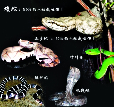 同濟醫(yī)院和協(xié)和醫(yī)院每年收治的蛇咬傷患者均有100多例,絕大多數(shù)是被蝮蛇咬傷,其他還有少量五步蛇、金環(huán)蛇、銀環(huán)蛇和眼鏡蛇。事件多發(fā)于水草豐茂的鄉(xiāng)村野外。八成患者的咬傷部位在腿腳,一成左右在手臂,還有約一成在身體其他部位。湖北省中醫(yī)院光谷院區(qū)每年接診蛇咬傷患者同樣有幾十例,多數(shù)來自武漢周邊地區(qū)。