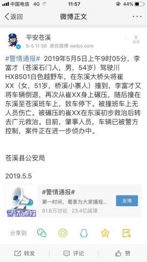 中新網廣元5月5日電 (苗志勇)記者5日從四川省廣元市蒼溪縣公安局獲悉,當日上午9時05分,該縣發生一起惡性交通事故,肇事駕駛員李富才(蒼溪縣石門人,男,54歲)駕駛川HX8501白色越野車,在東溪大橋頭將崔某某(女,51歲,蒼溪縣橋溪人)撞倒。隨后,李富才又將車輛倒退,再次從崔某某身上碾壓。后來,肇事車輛撞在東溪至蒼溪的客車上,致車停下。被撞客車上無人員傷亡。被二次碾壓受傷的崔某某在東溪初步救治后已轉至廣元市區醫院搶救。