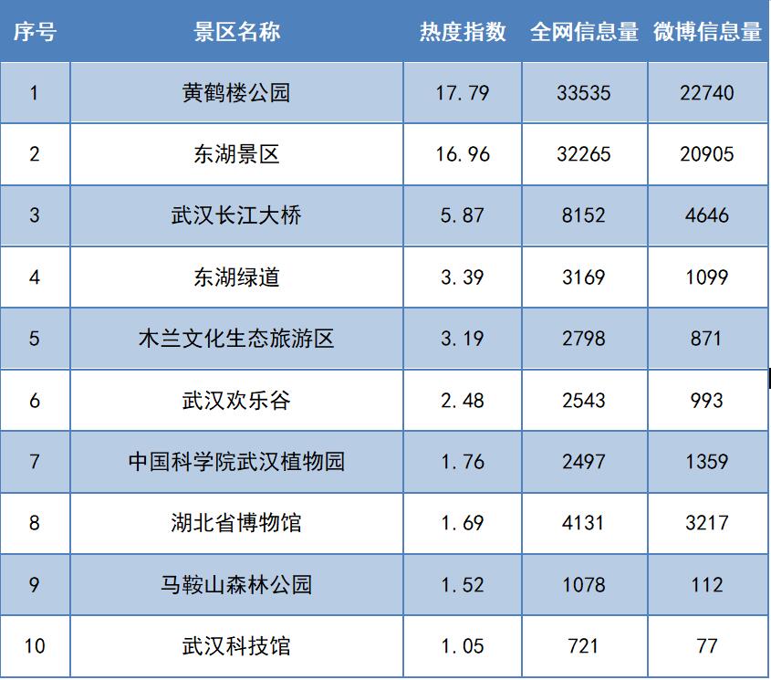 5月1日至4日期間,全網關于武漢及景區(qū)“五一”假期的全部信息共15.8萬條,其中微博信息共7.4萬條,占全部信息的47.1%?!包S鶴樓公園”作為武漢知名的5A景區(qū),熱度指數(shù)、全網信息量及微博信息量均處在武漢景區(qū)首位;“東湖景區(qū)”以16.96的熱度指數(shù)排在第二位,其他依次為武漢長江大橋、東湖綠道、木蘭生態(tài)旅游區(qū)、武漢歡樂谷、中科院武漢植物園、湖北省博物館、馬鞍山森林公園、武漢科技館。