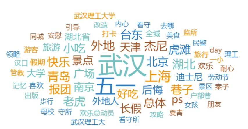 經統(tǒng)計,“武漢”“五一”“長假”“湖北”等詞成為“五一”期間武漢相關信息的核心關鍵詞。這從側面說明旅游成為當?shù)厝硕冗^假期的首選。從“景點”“景區(qū)”“戶部巷”“好吃”“武漢理工大學”等關鍵詞中可以看出游客的關注重點。