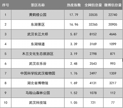 5月1日至4日,全網關于武漢及景區“五一”假期的全部信息共15.8萬條,其中微博信息共7.4萬條,占全部信息的47.1%。“黃鶴樓公園”作為武漢知名的5A景區,熱度指數、全網信息量及微博信息量均處在武漢景區首位;“東湖景區”以16.96的熱度指數排在第二位,其他依次為武漢長江大橋、東湖綠道、木蘭生態旅游區、武漢歡樂谷、中科院武漢植物園、湖北省博物館、馬鞍山森林公園、武漢科技館。