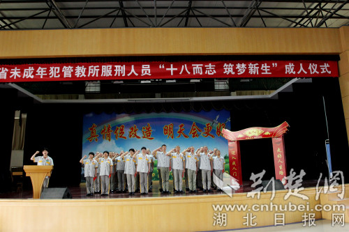 荊楚網(wǎng)客戶端一荊楚網(wǎng)消息(通訊員 余火焰 孫新明)2019年5月6日上午,湖北省未成年犯管教所服刑人員"十八而志 筑夢新生" 成人儀式在監(jiān)內(nèi)文化活動中心舉行,41名年滿18歲的服刑人員宣誓成人。集體宣誓、簽名前,41名服刑人員伴隨18響的鼓聲,走過成人門,在話筒前每人說了一句最想說的話。