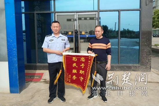 荊楚網客戶端—荊楚網消息(通訊員范文斌、時海) 5月5日,節后上班第一天,武漢居民施老爹在鄂州市救助站工作人員的陪同下,來到鄂州市公安局巡特警支隊城東綜合執法服務站,將一面印有“忠于職守、為民服務”的錦旗送到了該站民警劉紅安手中,感謝民警熱心助力,幫他找回了失散六年之久的兒子。