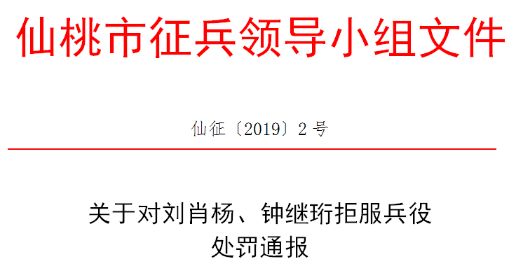 劉肖楊、鐘繼珩拒服兵役行為,挑戰法律權威,嚴重干擾征兵秩序,為切實維護兵役制度的嚴肅性,警示教育社會適齡應征青年,依據《中華人民共和國兵役法》、《湖北省征兵工作條例》、《解決入伍新兵拒服兵役問題暫行辦法》等有關法律法規的規定,經市征兵工作領導小組會議研究決定,對劉肖楊、鐘繼珩2人做出如下處罰: